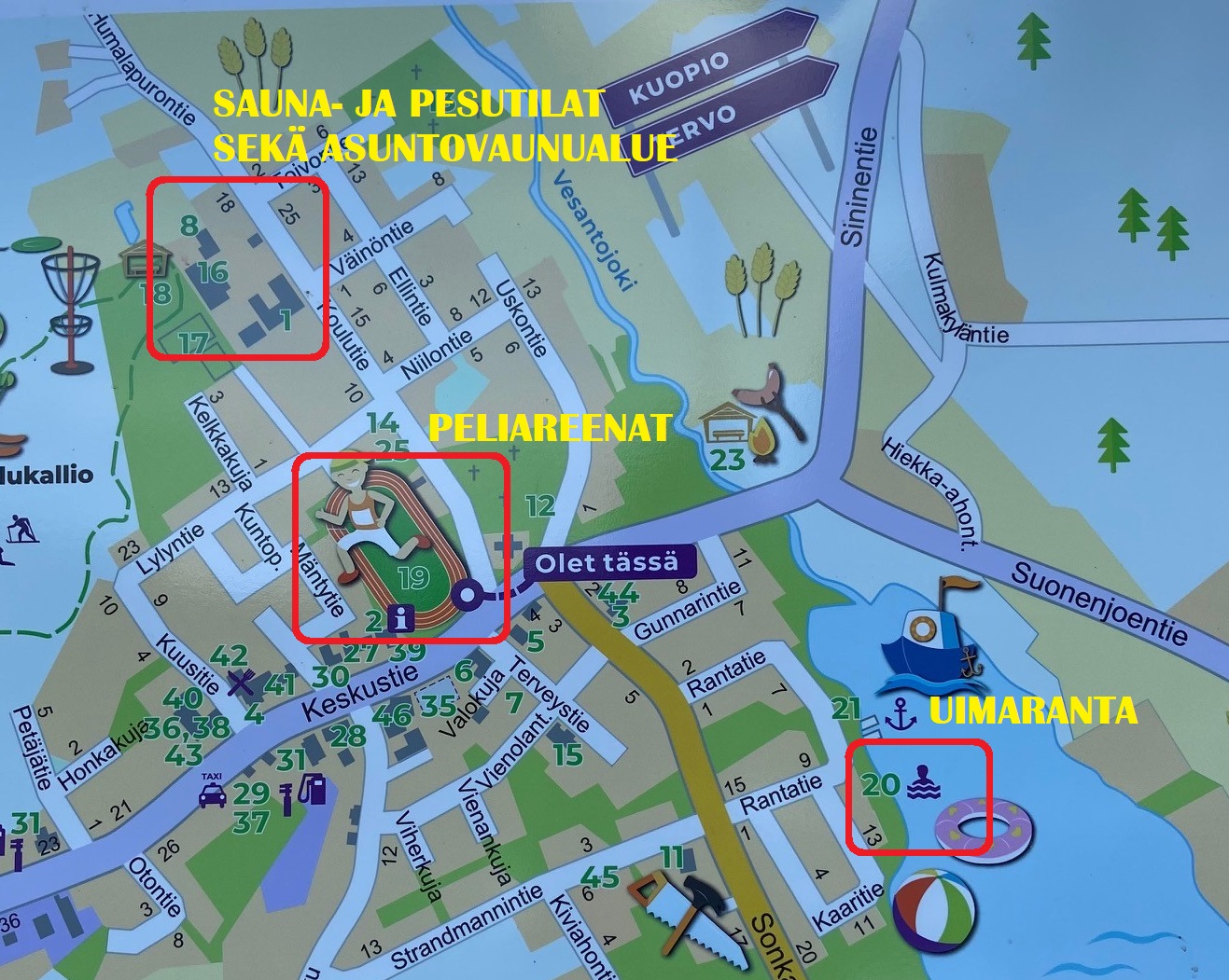 Asuntovaunualue, sauna- ja pesutilat, uimaranta kartalla